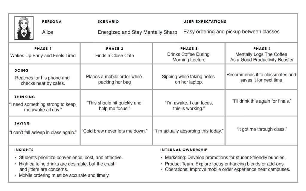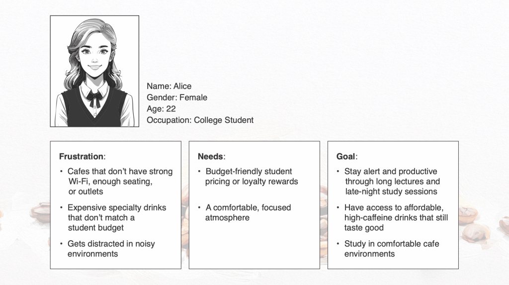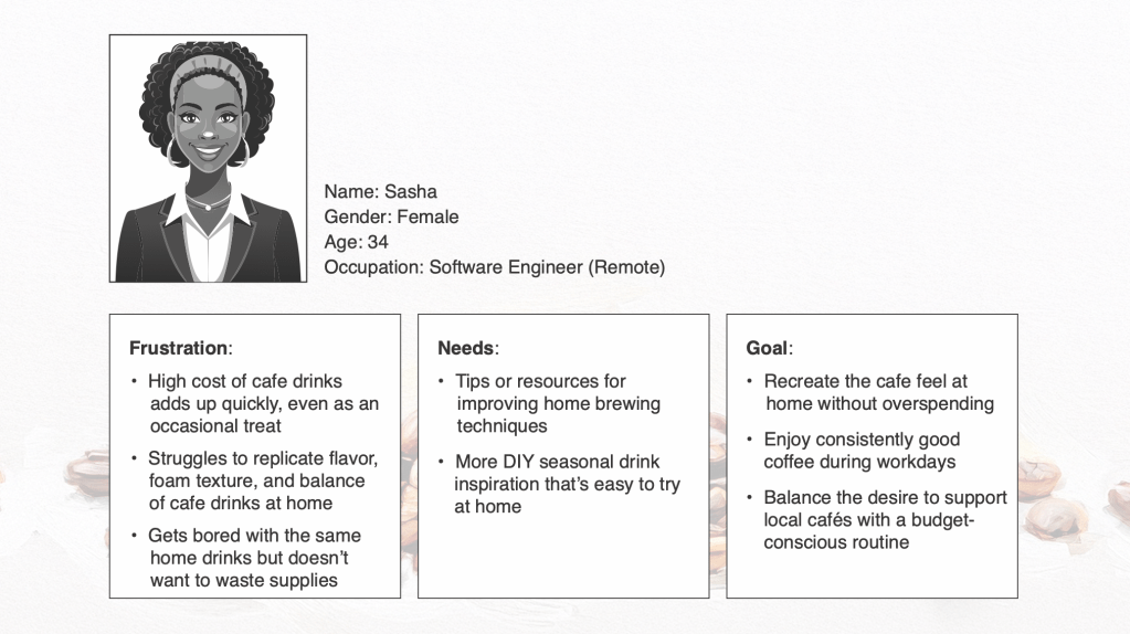 Offer cafe-at-home kits Users like Sarah want help recreating the café experience at home. Kits with recipes, tools, or rotating seasonal features could bridge that gap and keep users engaged.