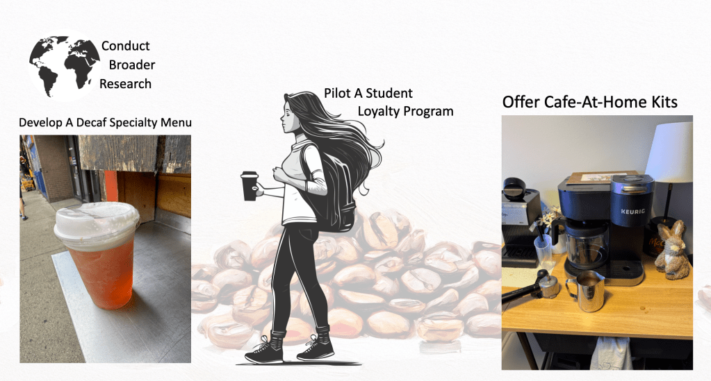 Develop a decaf specialty menu Users like Ana are looking for flavor-forward, thoughtfully made decaf drinks. Treating decaf as a first-class offering can serve an underserved group and differentiate the brand.